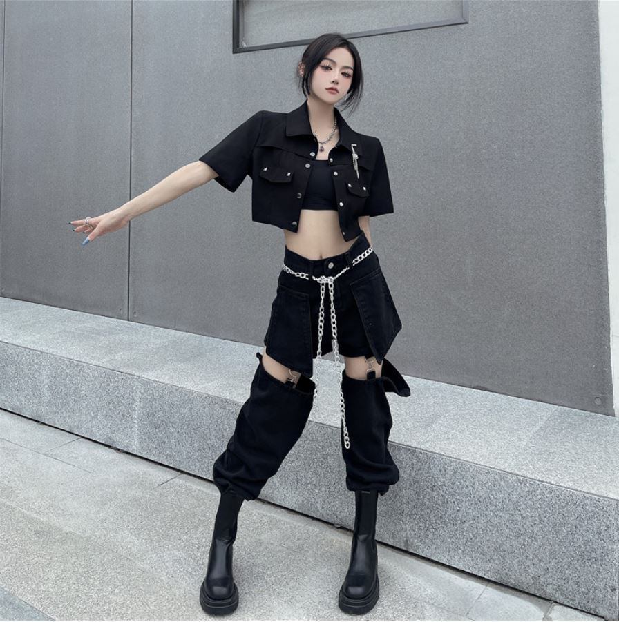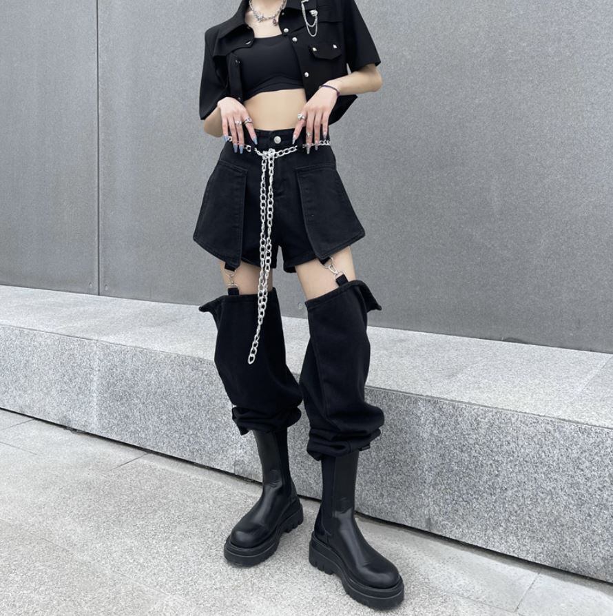 レディース ボトムス デニム ジーンズ 黒 ブラック おしゃれ モダン 個性 ストリート チェーン付き オルチャン 韓国ファッション 319